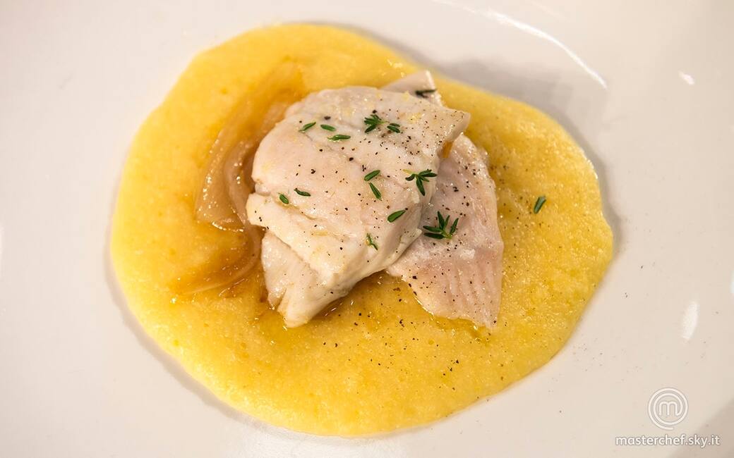 Impiattare versando uno specchio di polenta, i tranci di platessa e le cipolle caramellate. Decorare con qualche foglia di timo