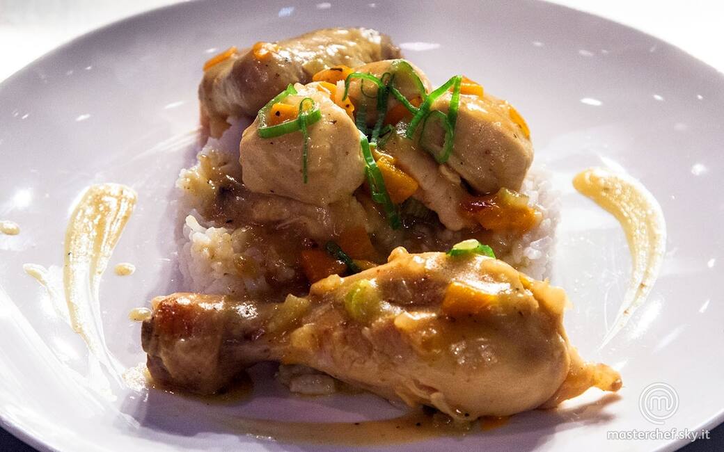 Impiattare disponendo con l’ausilio di un ring circolare il riso basmati. Disporre le cosce di pollo e completare con una spolverata di prezzemolo, il peperoncino tagliato a fette sottili e la salsa rimasta.