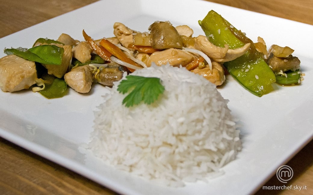 Creare una cupola di riso con una ciotolina, e disporre attorno il pollo saltato con le verdure.