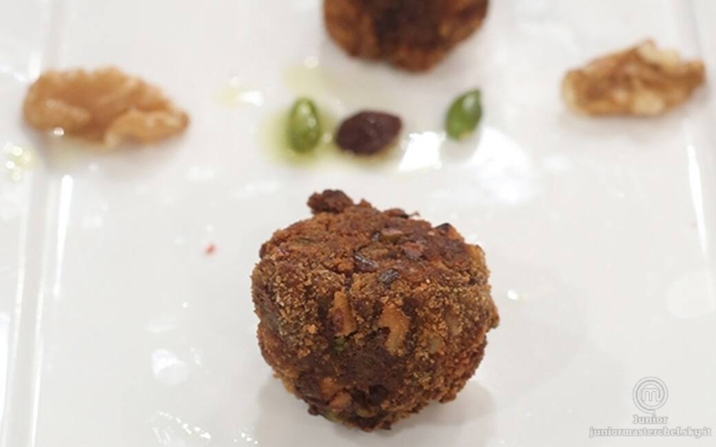 Creare una cornice di pistacchi interi e all’interno disporre a righe alternare pistacchi e uvetta. posizionare nel piatto le polpette e una noce spaccata a meta. aggiungere sulle polpette un misto di frutta secca.
