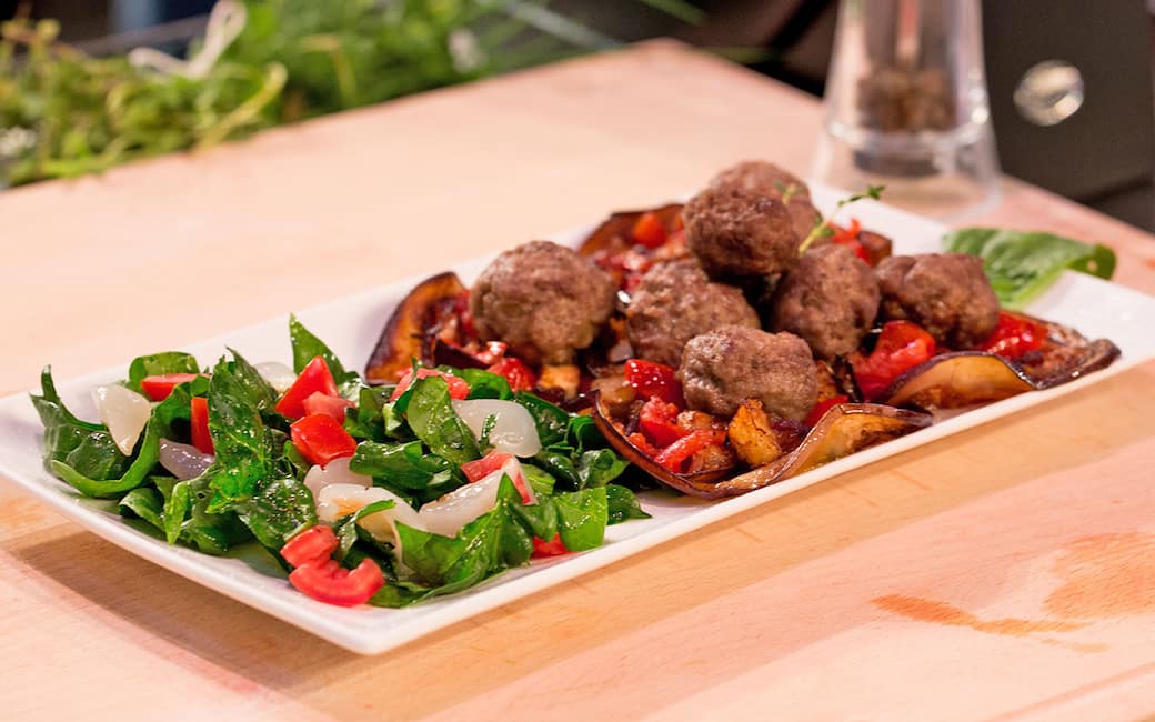 Su 4 piatti rettangolari, creare su un lato un letto di fette di melanzana fritta, coprire con il sugo di pomodori e melanzane e distribuire sopra le polpettine. adagiare sull'altro lato l'insalatina di spinaci, pomodori e litchi.