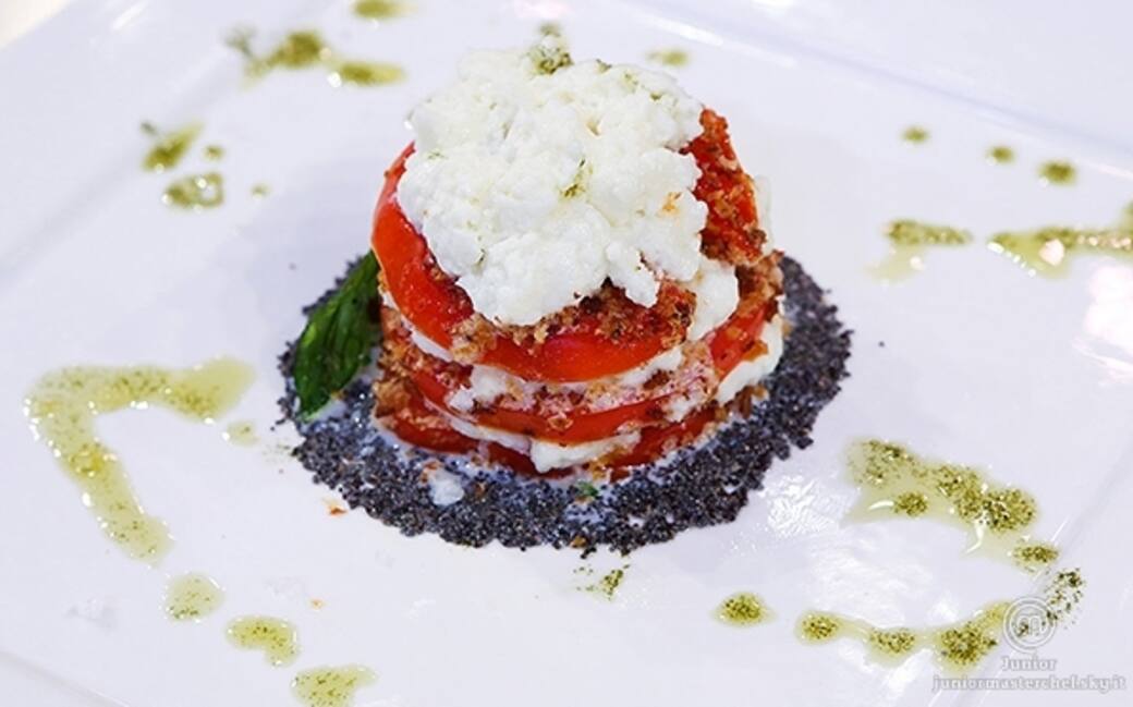 Tagliare il pomodoro e passare le fette nell'olio aromatizzato e poi nella crosta di pane sbriciolata in precedenza. aiutandosi con un coppapasta fare un cerchio con dell'olio e spolverare sopra dei semi di papavero. mettere al centro una fetta di pomodoro, poi la mousse di mozzarella e poi di nuovo una fetta di pomodoro creando una torretta. ultimare con un pizzico di sale a fiocchi.