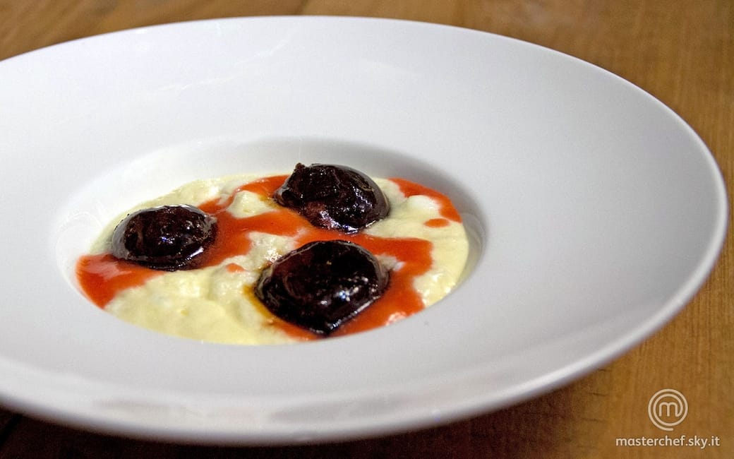 Incorporare i tuorli mescolandoli con 50 g di zucchero e aggiungendo la ricotta. Una volta ottenuto un composto omogeneo, versarlo in planetaria e montarlo a velocità minima insieme alla meringa preparata precedentemente, che non deve sfaldarsi. Una volta che la crema avrà raggiunto una consistenza omogenea, versare in una boule e tenere da parte.