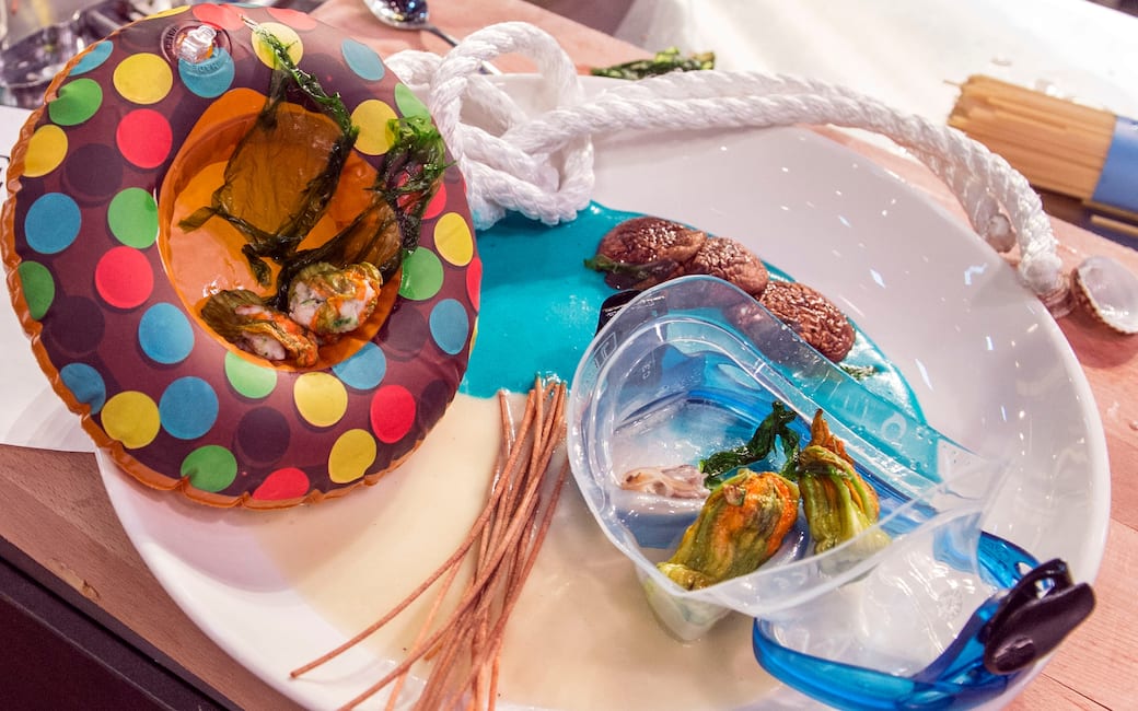 Impiattare versando le due salse di patate nel piatto, adagiare gli spaghetti fritti, i funghi shitake e qualche goccia di salsa al pane nero. Disporre i fiori di zucca ripieni nel salvagente e nella maschera, e in quest’ultima aggiungere anche i tartufi rimasti. Decorare con le alghe a piacere.