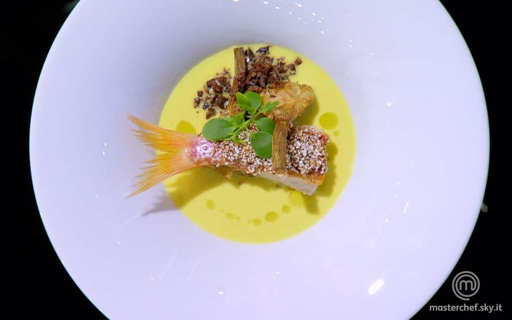 Impiattare disponendo un letto di crema al latte di cocco e curcuma, adagiare la triglia, il carciofo e il pop corn di amaranto. Aggiustare di olio evo e sale.