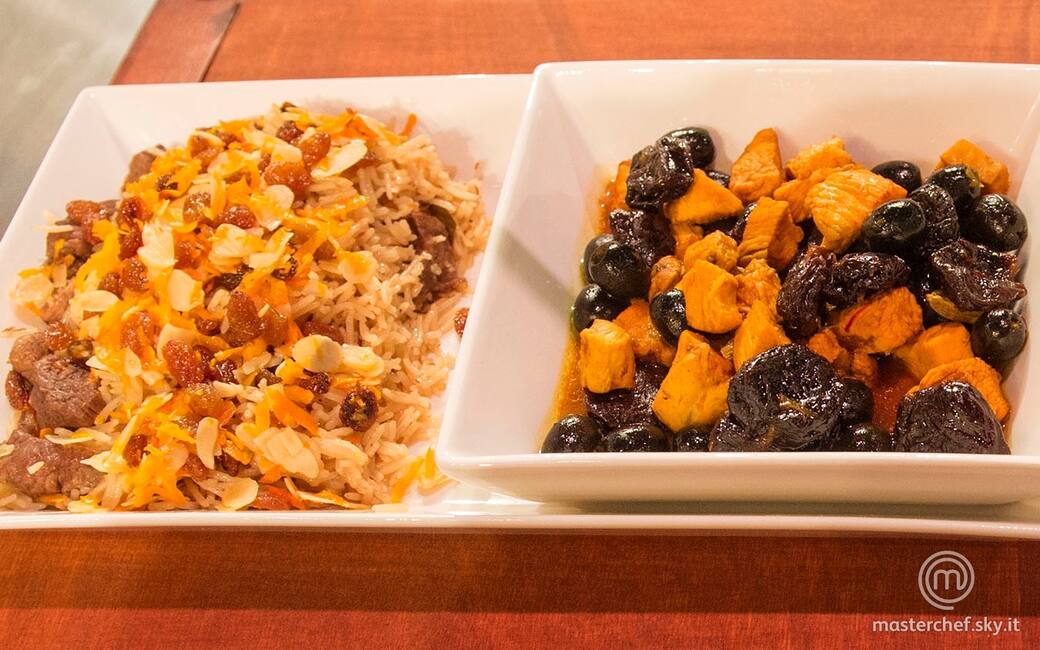 Per il pollo alle spezie: tagliare il pollo a pezzi grossolani. Tagliare la cipolla molto finemente, fino ad ottenere la consistenza di una crema granulosa. Soffriggerla in padella con un filo di olio di semi, aggiungere un cucchiaio di zucchero e versare il pollo per rosolarlo. Aggiungere 6 bacche di cardamomo chiuse, una manciata di zafferano e un cucchiaio di curcuma e mescolare, fino ad ottenere un colore arancione caldo. Far cuocere il pollo aggiungendo acqua all'occorrenza e, a 5 minuti dalla fine della cottura, salare e aggiungere le olive e le prugne.
