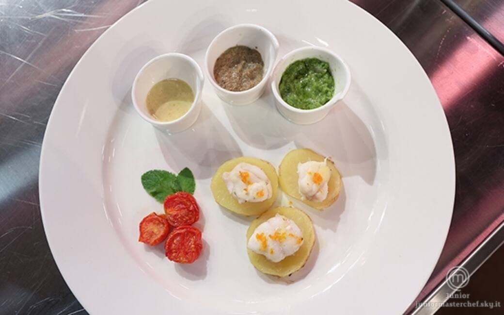 In una pentola mettere l'acqua e gli aromi e aggiungere il cestello sul quale adagiare i due filetti di rana pescatrice e le patate lavate , sbucciate e tagliate a fette. lasciare cuocere a vapore per una decina di minuti e lasciare raffreddare dopo aver aggiunto sale e olio evo. nel forno preriscaldato adagiare sulla carta da forno qualche fetta di patata e lasciarla grigliate qualche minuto finche e ben dorata.