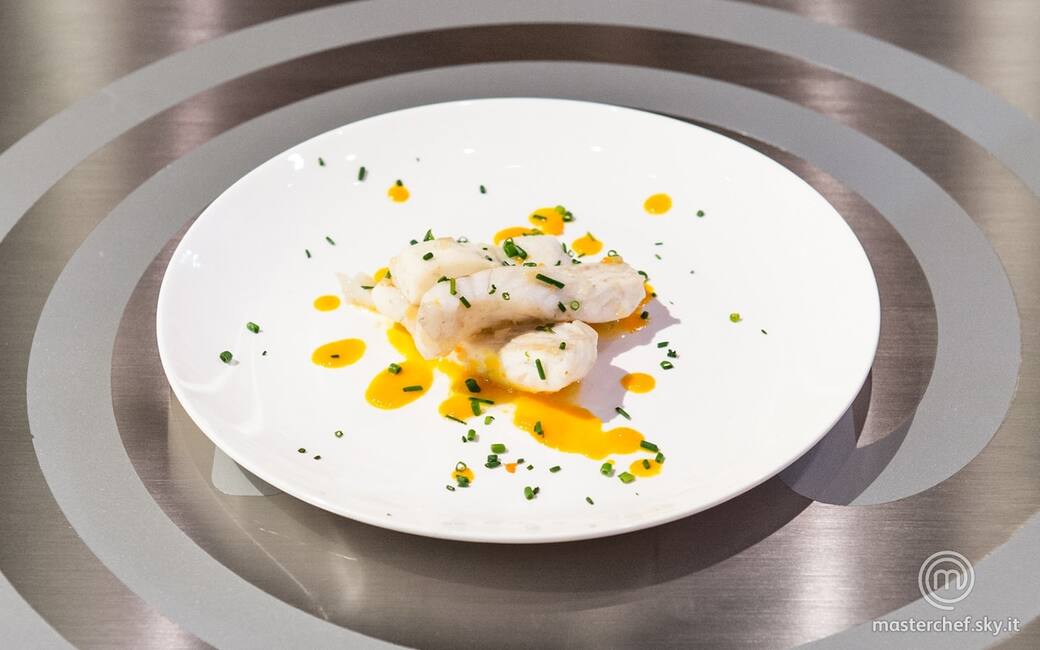 Aggiustare di sale e pepe la salsa alla carota, passarla al colino e lasciarla gocciolare sul piatto. Posizionare i filetti di rombo, e completare con il trito di erba cipollina.