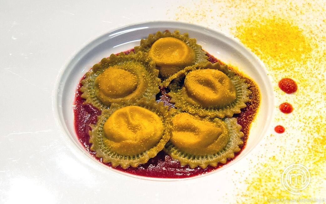 Impiattare i ravioli su un letto di salsa alla barbabietola e completare con qualche goccia di coulis di lamponi.