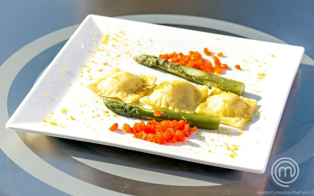 Impiattare disponendo due cucchiai di dadolata di peperone, due asparagi, tre ravioli e una grattugiata di scorza di lime e di bottarga.