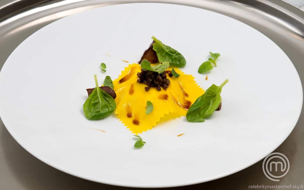 Per il ragu soffriggere il sedano, la carota e la cipolla in una casseruola a bordi bassi, aggiungere la polpa di carne leggermente arrostita e lasciare cucinare per qualche minuto. sfumare con il vino rosso e lasciarlo evaporare. aggiungere un po’ di acqua di pomodoro verde, poca salsa di vitello e portare alla giusta consistenza sistemando di sapore se necessario.
