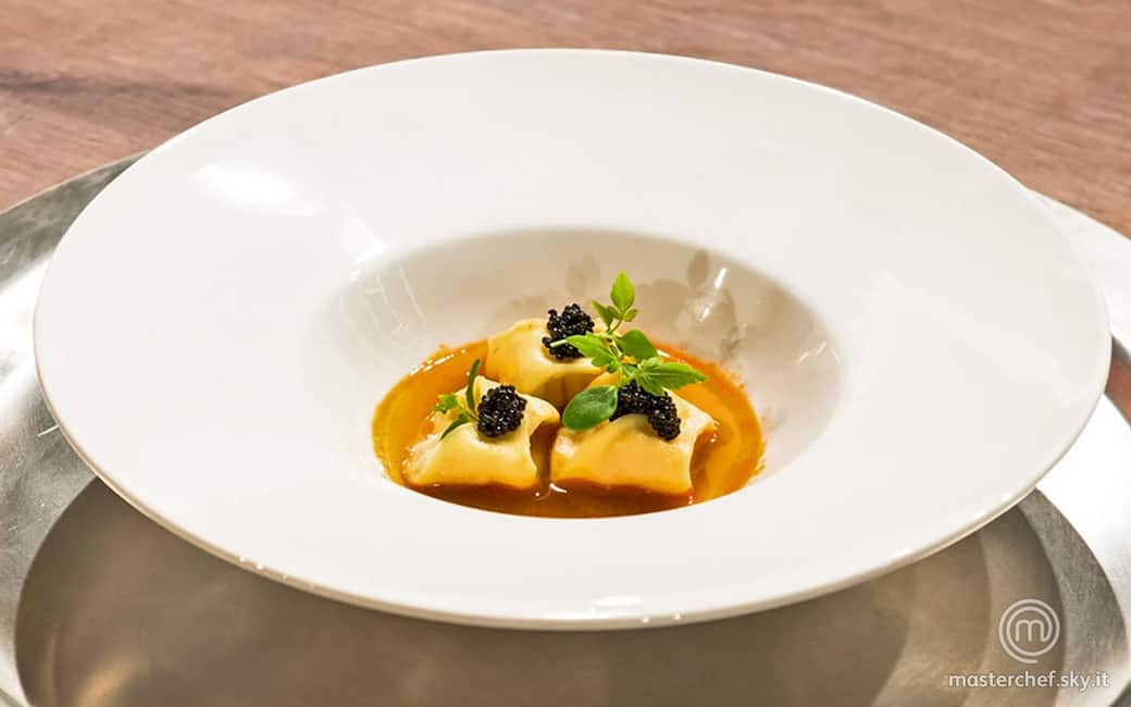 Impiattare la bisque in una fondina con 3 cappelletti al centro e decorare con germogli verdi e uova di lompo.