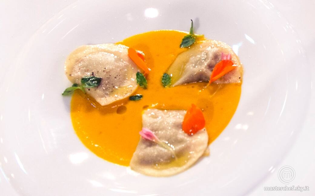 Impiattare versando la crema di carote e qualche goccia di centrifuga alla verza e alla menta. Disporre i ravioli e decorare con i petali dei fiori eduli e qualche fogliolina di menta. Aggiustare di olio evo, sale e pepe.