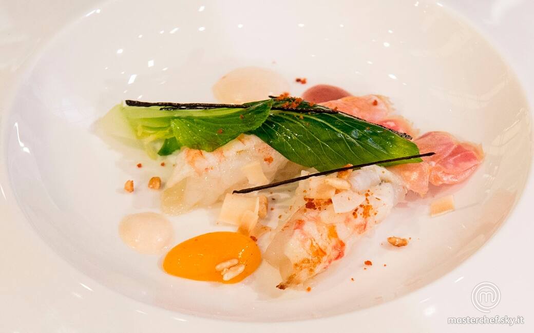 Realizzare una bisque con i carapaci degli scampi aggiungendo un volume di acqua pari al doppio di questi ultimi. Filtrarla e tenerla da parte. Per la polvere di corallo: frullare le teste degli scampi con l’ausilio di un minipimer, setacciare il liquido ottenuto, versarlo in una leccarda e lasciarlo essiccare in forno a 100 °C per un’ora e 30 o fino a quando non assumerà un aspetto granuloso. Frullarlo di nuovo. Per la mousse di bisque di scampo: ridurre la bisque di scampi fino a farle raggiungere un peso di 250 g. Nel frattempo mettere in ammollo la colla di pesce in una boule con acqua tiepida. Una volta ammorbidita strizzarla accuratamente, unirla ai 250 grammi di bisque, portare il composto a temperatura ambiente e aggiungere 100 grammi di panna montata, una presa di sale, una macinata di pepe e il cognac invecchiato. Riporre in frigorifero e far riposare per 10 minuti.