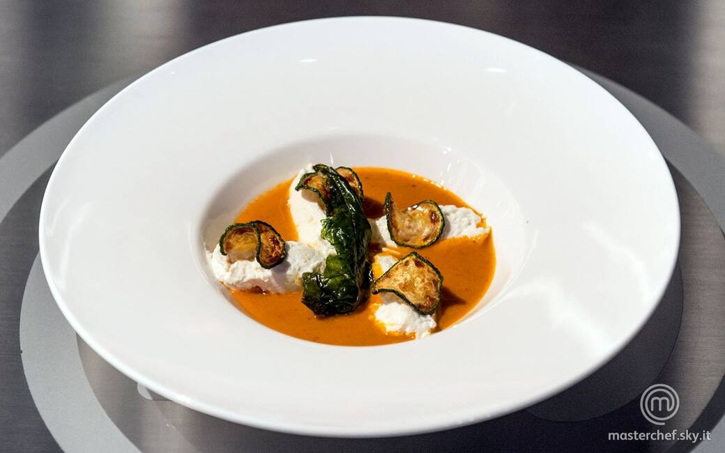 Impiattare versando la crema di pomodoro, le quenelle di ricotta e decorare con rondelle di zucchina fritta e la foglia di basilico.