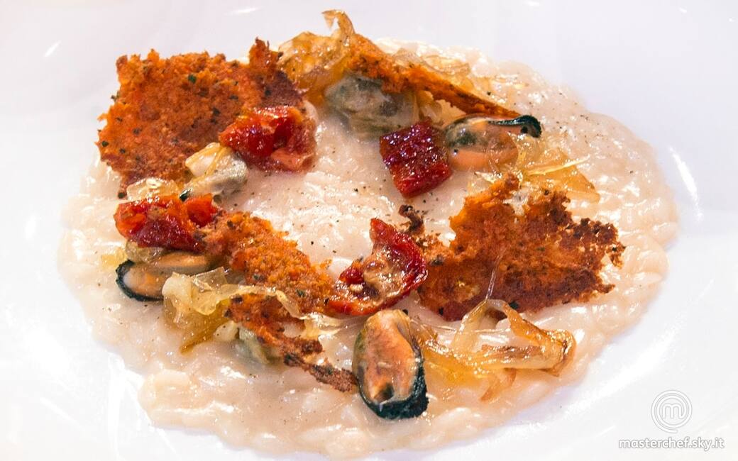 Impiattare versando il risotto e adagiando sopra di esso le cozze e le vongole, le chips di pane al pomodoro e i pomodori secchi con i cipollotti caramellati. Completare con una macinata di pepe.