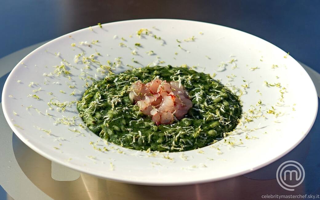 3. tritare finemente lo scalogno e lasciarlo soffriggere in una padella capiente con un filo di olio evo. dopo qualche minuto rimuoverlo e tostare nella stessa padella il riso per 1-2 minuti. aggiungere un mestolo dell’acqua di cottura degli spinaci, versare di nuovo lo scalogno e cuocere il risotto aggiungendo in modo alternato l’acqua degli spinaci e quella del basilico. a pochi minuti dalla fine della cottura aggiungere qualche pezzo di gambero crudo al risotto.
