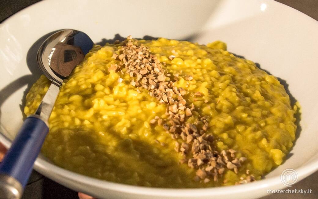 Impiattare disponendo il risotto e sopra una fila di anacardi tritati.