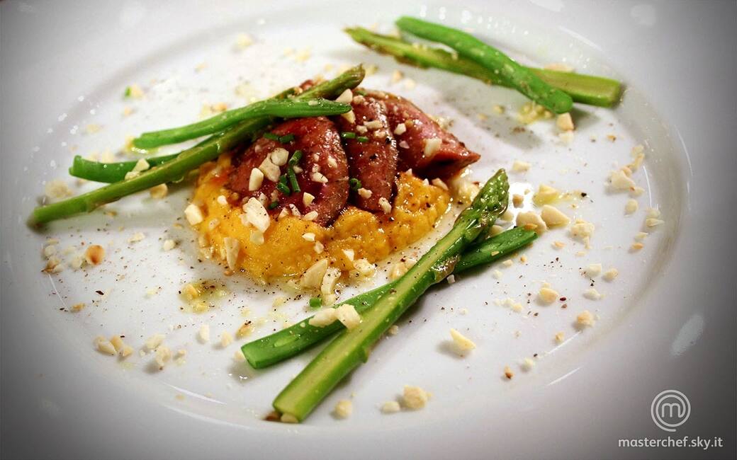Rognone rosa con purè di sedano rapa e patate dolci