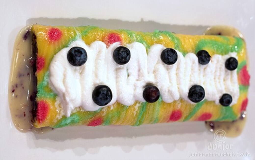 Rotolo con ganache montata al cioccolato bianco e composta di mirtilli