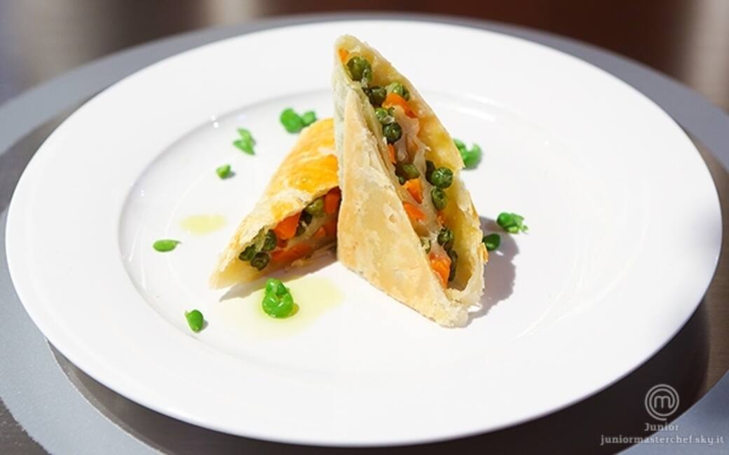 Tagliare le verdure a dadini. in una padella preparare un soffritto con olio, uno spicchio d'aglio. aggiungere nel seguente ordine le verdure: cipolla, carote, pisellini e infine fagiolini. lasciare cuocere a fuoco vivace per circa 8 minuti. nel frattempo stendere la sfoglia e tagliare il provolone a dadini.