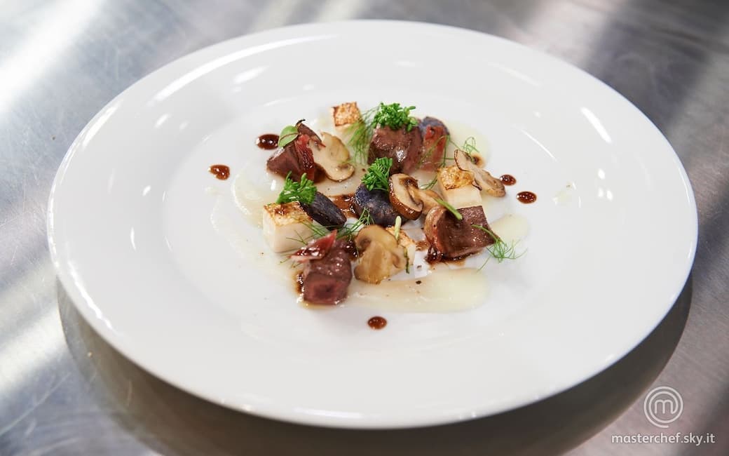 Impiattare disponendo ciuffi di crema di patata e rapa, i cubetti di cuore, gocce di teriyaki, i funghi, il bacon croccante a pezzi grossolani, i cubetti di rapa e la patata viola. Aggiustare di olio evo, sale e pepe e decorare con germogli misti.