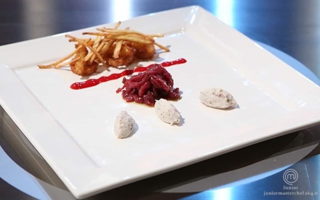 Preparare delle quenelle con il composto di ricotta e canocchie. estrarre la carne dalla marinatura, tagliarla a listarelle di 1 centimetro di spessore e condirla con olio e sale. impiattare tutti gli ingredienti come se si trattasse di un quadro: 3 quenelle a fiore, la carne al centro e decorare con la salsa e il fritto.