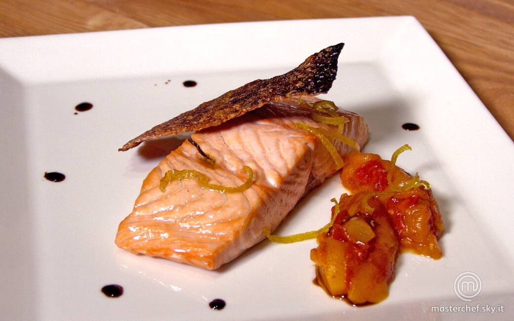 Guarnire il salmone con la sua pelle croccante, il limone candito e a lato il chutney di mango e pomodorini.