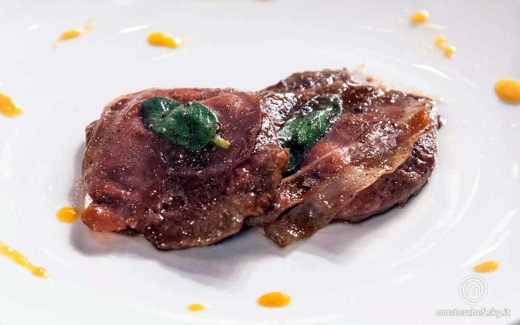 Impiattare disponendo due saltimbocca a testa e irrorare con il fondo di cottura.