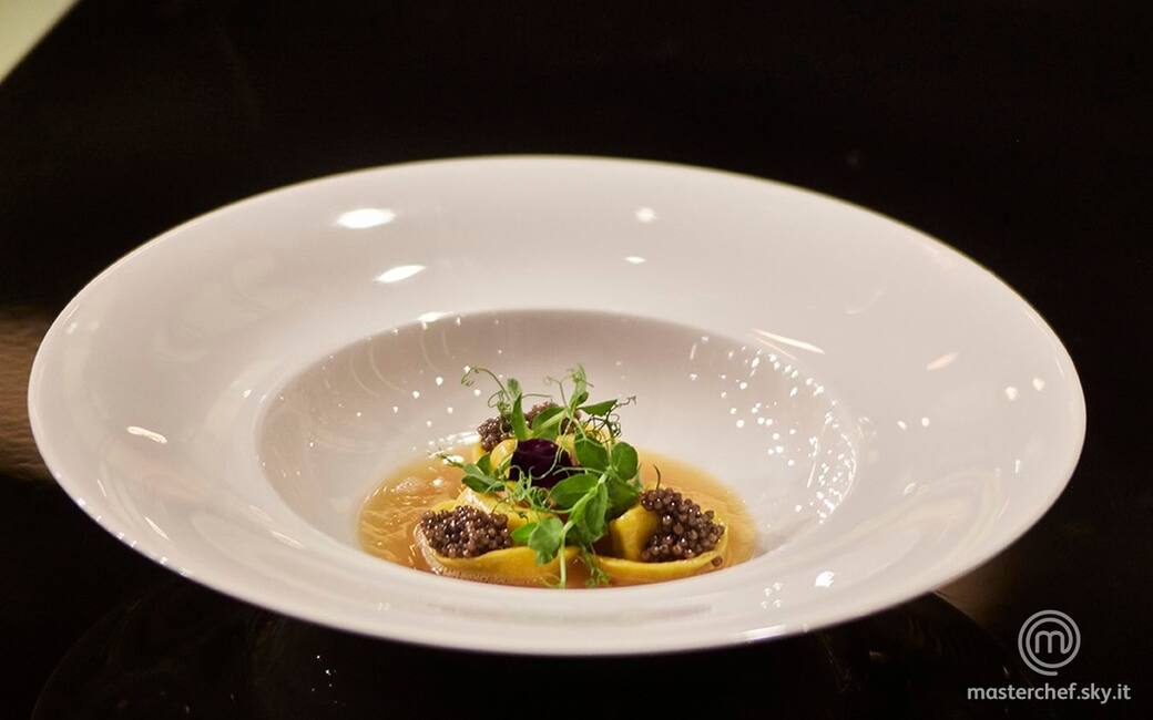 Impiattare versando alla base la salsa di pollo arrosto e disponendo poi i cappelletti i con un cucchiaino di caviale sopra ognuno. Guarnire infine con i germogli di pisello.