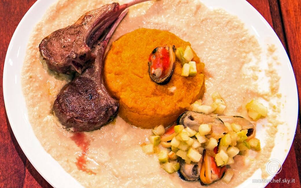 Impiattare disponendo la crema di melanzane, il tortino di zucca al centro coppato con un ring circolare, le cozze gratinate con la mela croccante e due costolette di agnello. Aggiustare di sale e pepe.