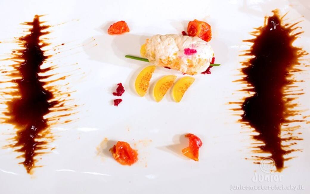 Impiattare l’involtino sopra a una spennellata di mostarda di frutta frullata e completare con dell’erba cipollina, una riduzione di aceto balsamico e un pomodorino caramellato.