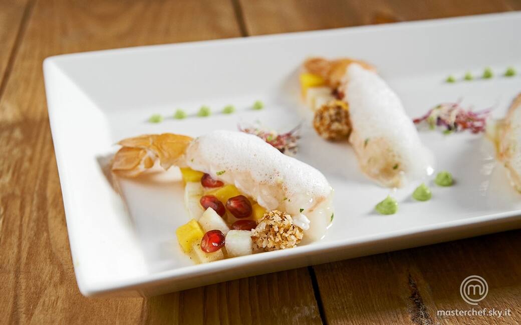 Adagiare la crema di avocado e cipollotto sul piatto, posizionare sopra di essa la chinola (dal frigo) e l’altra frutta tagliata, gli scampi e dei germogli. Aggiungere al succo di cocco filtrato un cucchiaio di lecitina di soia ed azionare con un frullatore ad immersione fino ad ottenere la schiuma desiderata. Completare il piatto con l’aria di cocco.