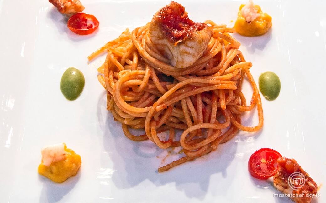 Impiattare disponendo gli spaghetti, i pomodorini al forno, la crema di patata dolce e un’oliva tagliata a metà. Completare con qualche pezzo di filetto di scorfano.