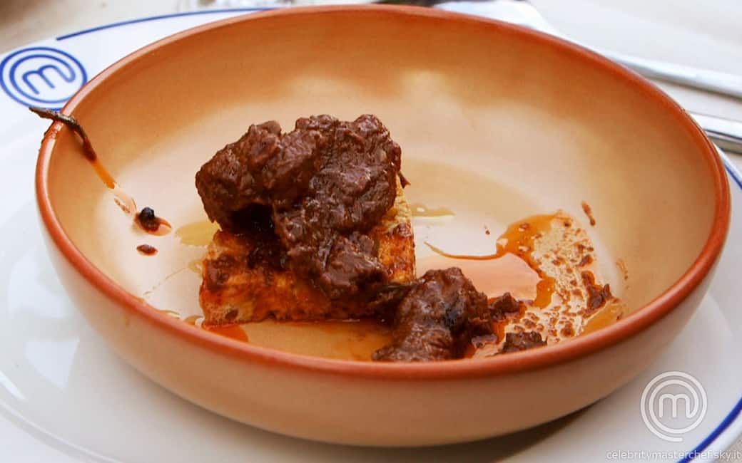Mettere una fetta di pane tostato in ogni piatto e distribuirvi sopra la carne con il suo sugo.