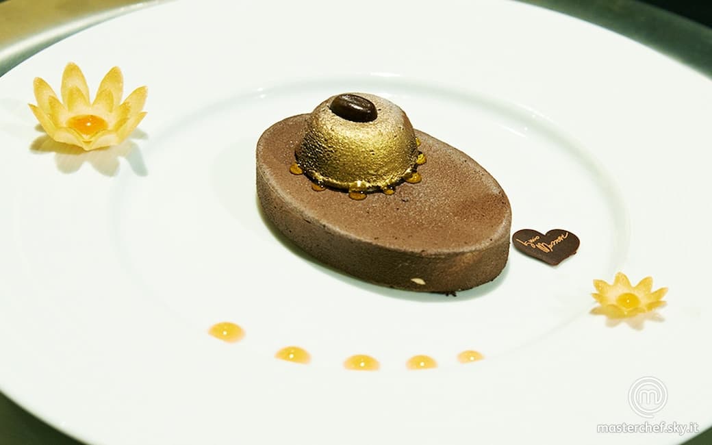 Iniziare cuocendo in un pentolino non troppo grande 200 g di caffè espresso con lo zucchero fino ad una temperatura di 121°C. Versare a filo su 450 g di tuorli d’uovo mentre montano in una piccola planetaria e lavorare fino ad intiepidimento. In un tegame mettere i fogli di gelatina coperti con acqua fredda ad ammorbidire; una volta morbidi strizzarli e scioglierli a bagnomaria oppure in forno a microonde ed incorporare ai tuorli montati. Aggiungere alla massa le tazzine di caffè espresso mescolate al caffè liofilizzato.