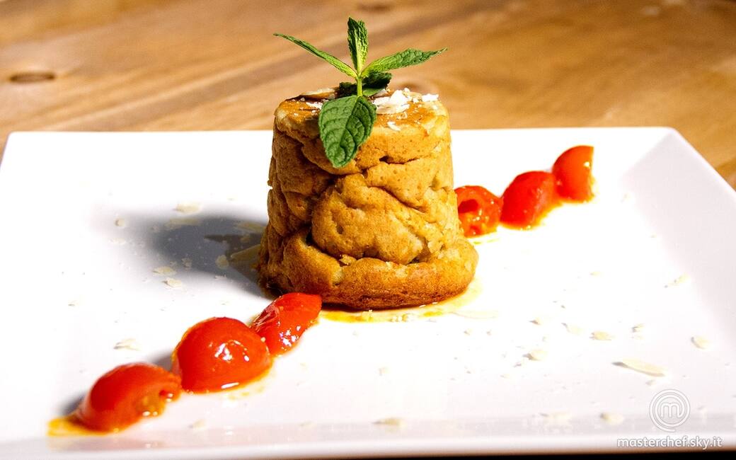Tagliare i pomodorini in quattro, scottarli in padella con una lacrima d’olio, aggiungere zucchero e caramellare leggermente. Sfornare lo sformatino e toglierlo delicatamente dallo stampino.