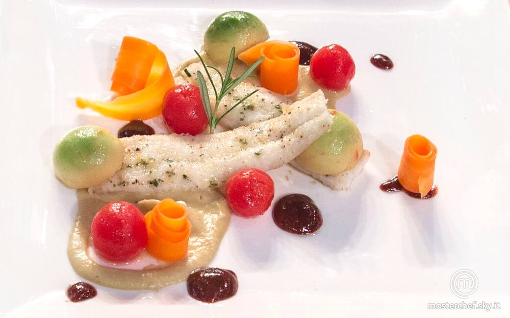 Impiattare disponendo la crema di melanzane e avocado, i filetti di sogliola, i pomodorini, le sfere di avocado e la salsa di prugne. Completare il piatto con dei riccioli di carote.