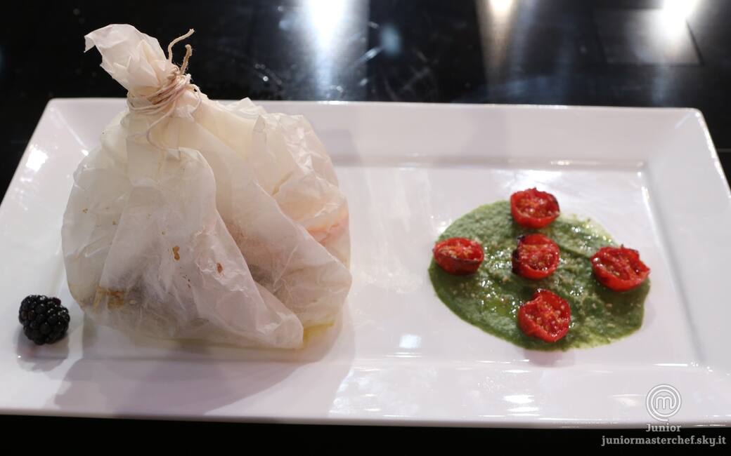 Per ogni porzione creare un cerchio di salsa con un cucchiaio (di diametro circa 8 centimetri), adagiare 5 mezzi pomodorini caramellati, spolverare con le nocciole tritate. adagiare il fagotto accanto.