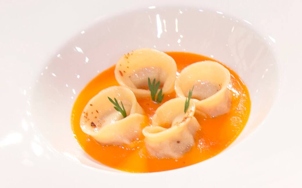 Stendere la pasta e ricavare i tortellini: tagliare la pasta in quadrati, disporre il ripieno e piegarli a triangolo, punta su punta, premendo bene i bordi per farli attaccare. Prendere il triangolo di pasta ottenuto, piegare verso l'alto la base del triangolo, appoggiare la pasta ottenuta sul dito indice e unire le due estremità della base attorno al dito con una lieve pressione, aiutandosi con l’altra mano. Cuocere i ravioli in abbondante acqua salata per 3 minuti.