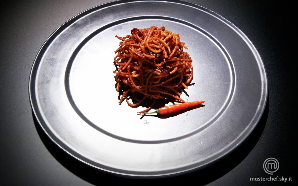 Fare ammorbidire gli spaghetti prima di togliere l'aglio ed il peperoncino. Con una spatola spingere la pasta verso i bordi della padella e mettere al centro un mestolo di salsa densa. Coprire con altro sugo diluito e delicatamente portare gli spaghetti verso il centro, girando intorno alla circonferenza della padella. Ripetere questa operazione fino a quando saranno cotti. Aggiustare di sale, aggiungere un mestolo di salsa densa, mescolare ed alzare la temperatura dei fuochi. Non toccare più la pasta e lasciarla sfrigolare e sbruciacchiare per un minuto, fino a rendere gli spaghetti più esterni ben croccanti.