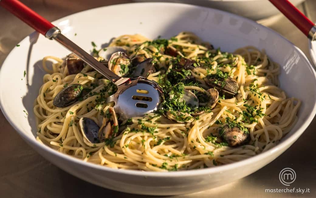 Impiattare avendo cura di disporre per ogni piatto una giusta quantità di vongole e di sughetto.