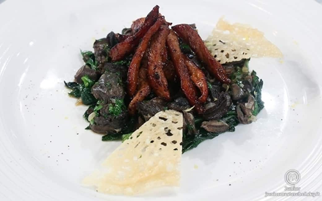 Comporre il piatto adagiando gli spinaci, lo spezzatino di lumache e, per ultimi, gli straccetti di maiale. grattugiare la scorza di pompelmo per dare freschezza al piatto.
