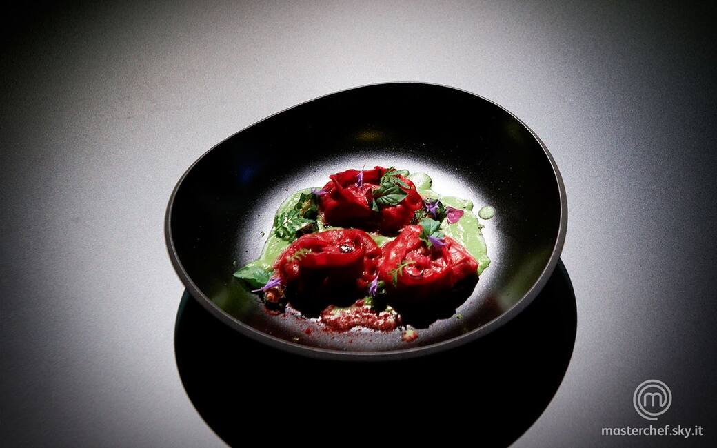 Rosolare i ravioli nel wok con olio di sesamo e portare a cottura aggiungendo una miscela di due parti di acqua e una di succo di barbabietola.