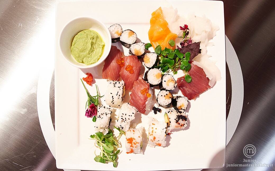 Impiattare disponendo al centro di un piatto quadrato i maki, i nighiri, gli uramaki con dei fiori eduli e dei chicci di melograno sparso. al lato del piatto disporre il sashimi e le foglie di zenzero che serviranno a pulire il palato. ultimare posizionando una ciotolina con la salsa wasabi.