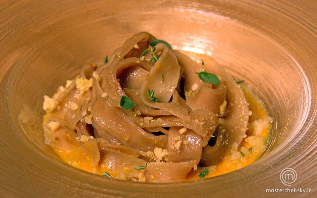 Tagliatelle di bietola rossa con acciughe, friselle e crema di pomodorino giallo