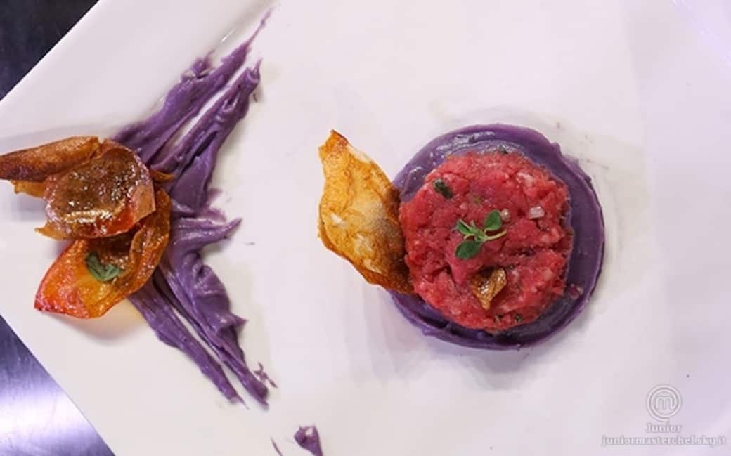 Tartare di manzo con crema di patate viola