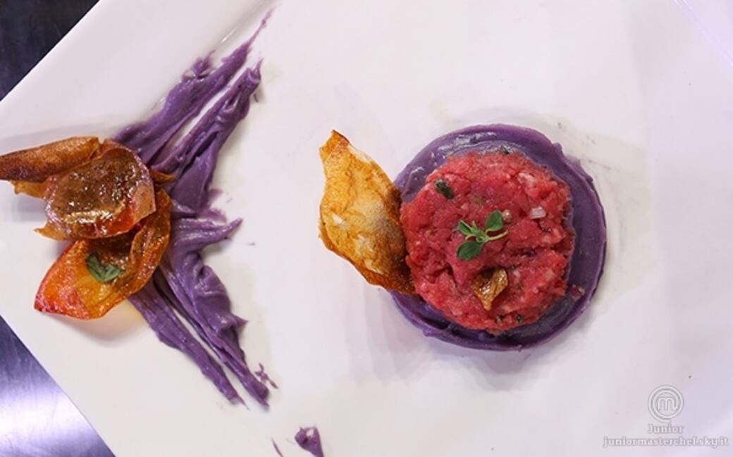 Impiattare il tutto servendosi di un coppa pasta per dare forma alla tartare e spolverando con un tocco di maggiorana.
