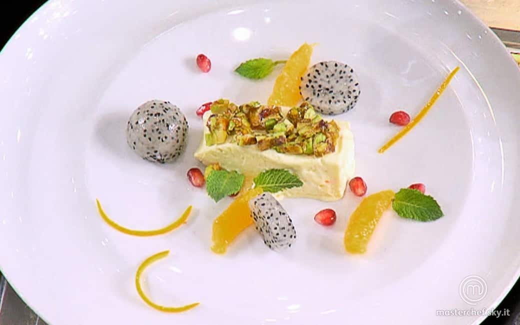 Disporre il semifreddo al centro coperto di croccante al pistacchio ed affiancare la frutta e le zest. Nappare con la salsa allo zafferano e decorare con foglie di menta.