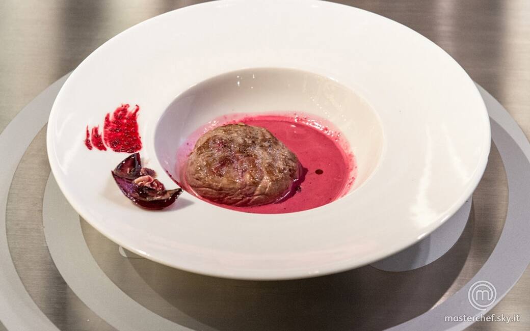 Impiattare in un cappello da prete: disporre sul fondo l’insalatina di radicchio marinata, la salsa alla rapa rossa e il controfiletto, con qualche fiocco di sale. Completare con un un cucchiaio di insalata al radicchio sul lato, 2 petali di cipolla in agrodolce e una pennellata di riduzione al vino rosso.